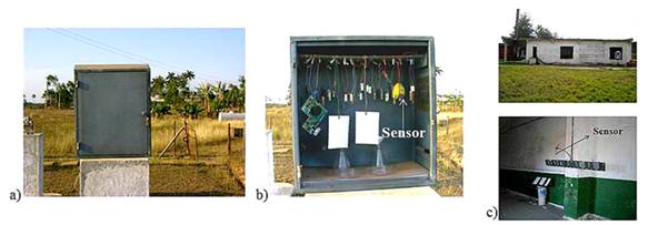 El sitio de exposición adquiere su identificación en dependencia de su condición. En caso de interior a espacio cerrado, es cuando no existe ninguna ventilación desde el exterior en el local y soterrada cuando se trata de un refugio o silos debajo la tierra. Se nota, además, los sensores para la medición del complejo humedad relativa-temperatura (Figuras 3 b) y c).