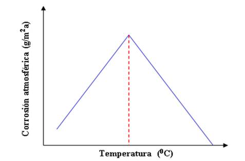 Con relación a la temperatura, la definición del complejo dada anteriormente, es tomada hasta ciertos valores promedios mensuales y anuales. Lo que sucede realmente es que, a valores muy elevados de temperatura, donde se origina un calentamiento excesivo en la superficie del material metálico expuesto directamente a la atmósfera, la corrosión atmosférica tiende a disminuir considerablemente, a tal punto que no ocurre. Esto se debe a la eliminación total de la película de agua depositada en la superficie del material metálico, originada por el proceso de condensación en la atmósfera o el contacto con superficies frías en la nocturnidad, en horas de la mañana, así como antes y después de la caída de la lluvia. De ahí, a que la dependencia de la corrosión atmosférica con la temperatura en climas tropicales costeros como el de Cuba sea caracterizada por una función de pico (Figura 4). Vale recordar que, la corrosión atmosférica ocurre mediante un mecanismo de naturaleza electroquímica debido a la película de agua que se deposita sobre la superficie de los materiales metálicos expuestos a la atmósfera de forma directa (condición al exterior) y de forma indirecta (condiciones interiores).