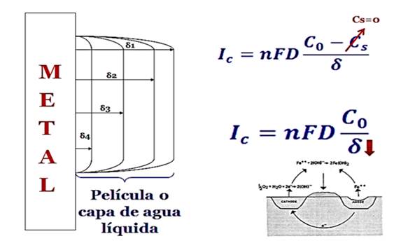 La experiencia basada en el incremento de la temperatura de la atmósfera hasta un cierto valor sobre la película de agua líquida es demostrada (Figura 5). Se destaca además de los cuatro componentes, cómo la película de agua posee un espesor (δ) que puede ser medido en micrómetros o milímetros. El incremento de la temperatura en la superficie del material metálico origina un cambio en el estado físico-técnico de la sustancia de líquido a vapor saturado. De esta forma, el espesor de la película de agua (δ) tiende a disminuir (δ1 >δ2 >δ3>δ4) incrementándose la intensidad del fenómeno (Ic) debido a un mayor predominio de la fase de vapor. Esto trae como resultado una difusión (D) mayor del oxígeno hacia la superficie del material metálico y su posterior adsorción (Figura 5). De ahí, a que el paso controlador del proceso electroquímico del fenómeno de la corrosión atmosférica sea la difusión del oxígeno, es decir, se establece una diferencia de concentración entre el seno del electrolito (Co) y en la superficie metálica (CS). En esto influye también el pH alrededor de la neutralidad que posee el agua condensada depositada en la superficie de los materiales. Los iones metálicos salen en forma de cationes mediante la reacción anódica, dejando un número de electrones en el metal que son tomados por el oxígeno disuelto en el agua existente, lo cual representa la reducción catódica del agente oxidante. La concentración en la superficie de este tiende a ser cero (Cs = 0) (Figura 5). Producto del carácter electroquímico del proceso, se tiene en cuenta la constante de Faraday (F) y el número de electrones que se intercambian (n).
