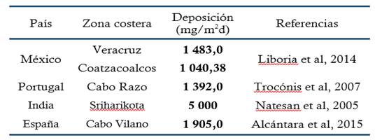 De acuerdo con la base de datos actualizada existente en el Laboratorio de Protección de Materiales de la Dirección de Investigación, Desarrollo e Innovación del CNIC, muy pocos valores promedios anuales de deposición de sales de iones cloruro, han sido determinados similares o superiores a 1800 mg/m2d en zonas costeras nivel mundial (Tabla 1). Evidentemente, se tratan de zonas con categorías estimadas y determinadas de agresividad corrosiva de la atmósfera de C4 (elevada), C5 (muy elevada) y CX (extrema) para los materiales metálicos más usados en la industria de la construcción y el hormigón armado. En el caso de la India, el valor promedio anual determinado se basó en una deposición seca, debido a los valores promedios anuales elevados de temperatura y muy bajos de humedad relativa (Tabla 1).
