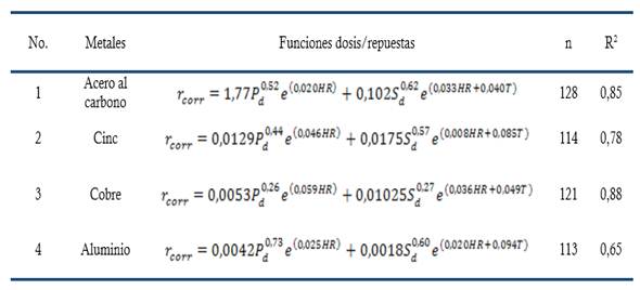 La segunda variante de estimación, se basa en el cálculo indirecto de la velocidad de corrosión anual a partir de la pérdida de espesor () para cada material metálico, haciendo uso de las funciones dosis/respuestas establecidas en la normativa de la especialidad de corrosión atmosférica (Tabla 2). Se trata de una variante más cualitativa en comparación con la primera variante basada en la descripción típica del ambiente atmosférico. Se entiende por funciones dosis/respuestas en estudios de corrosión atmosférica, a la relación derivada de los resultados de las pruebas de campo, es decir, en la condición de exposición al exterior para el cálculo indirecto de la velocidad de corrosión anual a partir de la pérdida de espesor, haciendo uso de los valores promedios anuales de los parámetros ambientales (ISO 9223:2012).