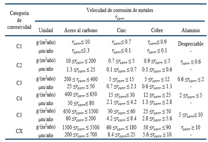 Para el cálculo indirecto de la velocidad de corrosión, se hace uso de los valores promedios anuales de deposición de sales iones sulfato, sales de iones cloruro, humedad relativa y temperatura. De ahí, la necesidad de ejecutar la primera variante de estimación basada en la descripción típica del ambiente atmosférico en estudios de corrosión atmosférica o evaluación de la agresividad corrosiva de la atmósfera en una zona previamente seleccionada. Los valores anuales de velocidad de corrosión () obtenidos, sirven para la estimación de la categoría de agresividad corrosiva de la atmósfera en la zona de estudio para cada material metálico, según los rangos de clasificación exigidos en la normativa de la especialidad (Tabla 3).