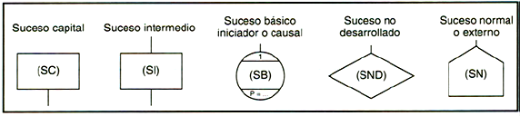 Sucesos. Su representación se indica (Figura 1). SC: suceso capital, de cabecera, o complejo (pero normalmente más fácil de intuir; por ejemplo: explosión de un recipiente a presión). SI: suceso intermedio. SB: suceso básico iniciador, causal o sencillo. SND: suceso no desarrollado porque no hay información o porque no se considera necesario. Se procesa como un SB. SN: suceso normal (condiciones operativas normales de diseño) o externo. Se procesa como un SB.