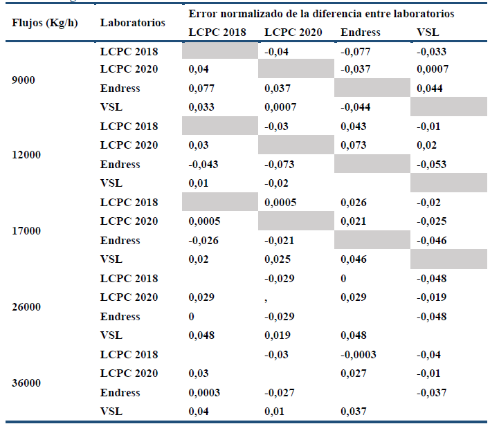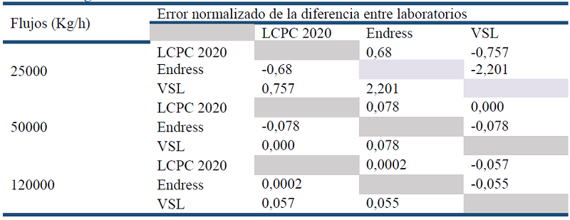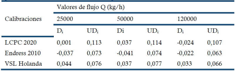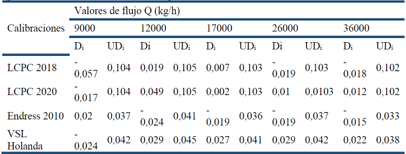 Las dos calibraciones previas (en fábrica y VSL) fueron realizadas con instalaciones que usan agua como líquido de trabajo y se limitaron a valores menores de flujo que las realizadas en el LCPC. Sin embargo, por su valor como referencia para evaluar los sistemas establecidos en el país se realizó una intercomparación de los resultados de las mediciones.