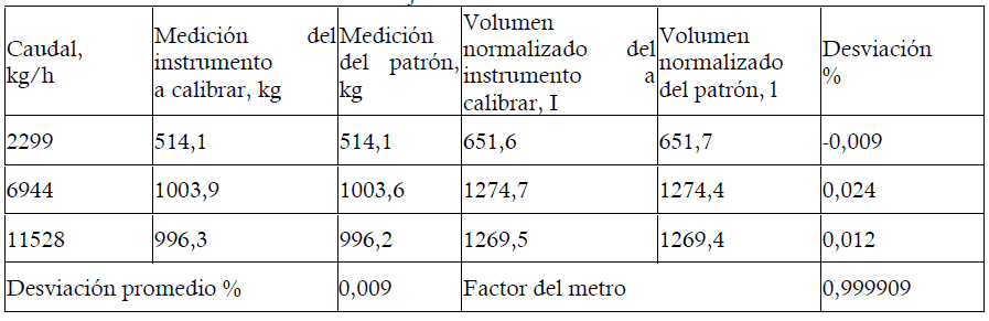 En la Figura 3 se muestran los resultados de la calibración del flujómetro del muelle de la Refinería de Petróleo Hermanos Díaz. En este caso, el 95 % de los valores se encuentran en el intervalo de ± 0,1 %.