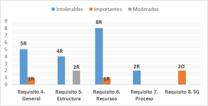 El Laboratorio, iinicialmente identificó un total de 15 riesgos, de los cuales, el 60% está relacionado con el Requisito 6 “Recursos” de la NC-ISO/IEC 17025: 2017, centrado en la interrelación de todo el personal y la obsolescencia del equipamiento. Entre los riesgos identificados, los principales fueron: el personal a cargo de las partes del sistema con más de 60 años, necesidad de personal con experiencia en las actividades técnicas especializadas para el mantenimiento de las actividades y servicios en el sistema y la obsolescencia del equipamiento del Laboratorio.