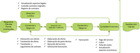 La eficacia de las acciones implementadas, posibilitó, la mejora del proceso de gestión de los SCT y la mejora en la interrelación de funciones de las direcciones de Comercial y de Negocios, Jurídica y auditoria, Contable Financiera con la dirección de I+D+i (Figura 3). Cada una de ellas constituyen funciones claves en el proceso de los SCT, por lo que la gestión, las oportunidades, la mejora y los riesgos de los servicios están muy estrechamente vinculadas a la cohesión, funcionamiento y cumplimiento de las responsabilidades de cada una de esas partes.