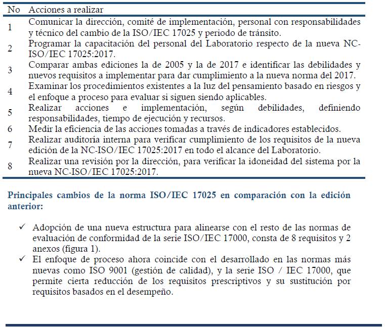 Para verificar cumplimiento con todos los requisitos de la nueva versión de la NC-ISO/IEC 17025: 2017 se planificó y se llevó a cabo una auditoría interna, la cual contempló todo el alcance del Laboratorio. De igual forma se planificó y realizó una revisión por la dirección, para verificar la idoneidad del sistema por la nueva NC-ISO/IEC 17025:2017. Se planificaron y se realizaron acciones de mejora. Se midió la eficacia de las acciones tomadas a través de indicadores establecidos.
