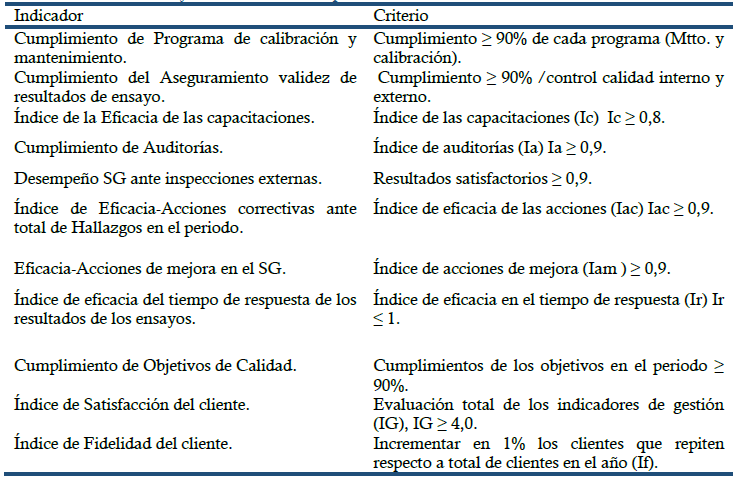 Para evaluar, la eficacia de las acciones realizadas en el logro de los objetivos en el periodo y satisfacer los nuevos requisitos de la NC-ISO/IEC 17025:2017, fueron evaluados algunos indicadores establecidos en el SG (Tabla II) (López, 2017).