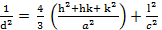 d:es la distancia entre dos planos adyacentesh k lson los índices de Miller correspondiente a los planos cristalográficosVolumen de la celda unidad (V):