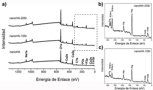 Por su parte, la Figura 3 muestra los espectros de la caracterización a través de la Espectroscopia Fotoelectrónica de Rayos-X (XPS) en donde se detectan los elementos atómicos de la HA, acordes con las energías de enlace características de los orbitales: Ca (2s, 2p, 3s y 3p), O (1s) y P (2s y 2p). Mientras que para las HA sustituidas (Figura 3b y Figura 3c) aparecen además las señales correspondientes al Sr (3p) lo que confirma también la inclusión del ion en la red y no una simple adsorción del elemento.