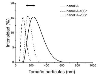 Con relación al análisis de las partículas por Dispersión Dinámica de la Luz (DLS) se determinó la distribución de tamaños hidrodinámicos de los polvos sintetizados (Figura 4). Los valores detectados se correponden con las dimensiones de los aglomerados más estables de las partículas, dado que éstas se aglutinan en suspensión a consecuencia de su elevada área y carga superficial a pesar de haber empleado polifosfato como dispersante. No obstante, los tamaños promedio de los aglomerados son nanométricos y van desde 150 a 270 nm, aunque no se detecta una tendencia clara con la incorporación del Sr2+ en el valor promedio de tamaños. Sin embargo, sí se detecta que hay influencia en la dispersión de los tamaños de partículas ya que para las dos HA substituidas se obtienen distribuciones de tamaños significativamente más estrechas en relación con la HA sin dopante.
