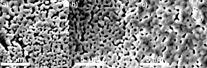 La Figura 5 muestra las imágenes de Microscopia Electrónica de Barrido (SEM) de discos de nanoHA pura y con Sr2+ como sustituyente (10 y 20%). En todos los casos es posible distinguir los granos cerámicos, la formación de cuellos de unión entre éstos y que a la temperatura empleada para la sinterización (900°C) aún no existe una coalescencia total de los granos cerámicos por lo que quedan espacios entre ellos y se obtienen estructuras porosas. Se observa, además, que tanto los granos cerámicos como las cavidades entre ellos (poros) son de dimensiones heterogéneas, que las piezas cerámicas aparentan una estructura más compacta con el incremento del contenido de Sr2+, pero que conservan aún microporosidad que parece estar interconectada.