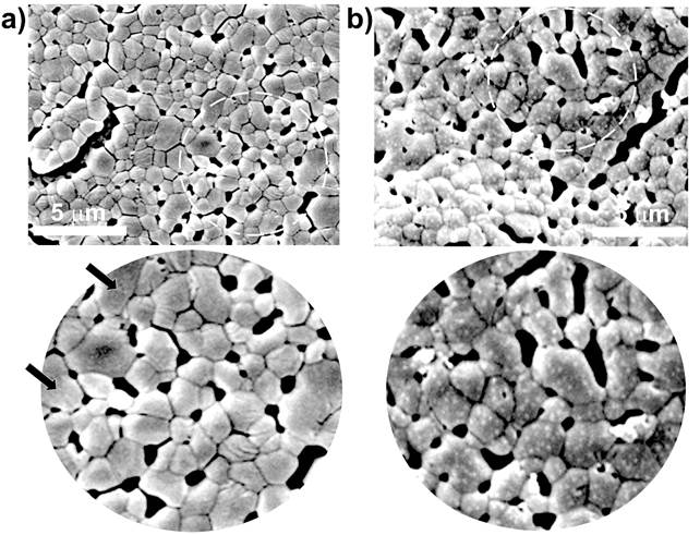 Finalmente, los estudios llevados a cabo de bioactividad in vitro por inmersión en Fluido Fisiológico Simulado refrendan que cerámicas obtenidas a partir de nanoHA dopada con Sr2+ aceleran los procesos de bioactividad como se observa en la Figura 7b), en donde se aprecia que a 21 días hay diferencias marcadas en comparación con las cerámicas sin dopar, Figura 7a) dado que se detecta la presencia de núcleos de depósitos fosfatocálcicos sobre los granos cerámicos, lo que no ocurre de forma clara aún con las cerámicas sin dopar al mismo periodo de inmersión. Las flechas en la Figura 7a) indican sólo la somera presencia de núcleos amorfos de un depósito superficial en los granos cerámicos.