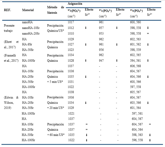 Estos cambios en las posiciones FTIR de las señales asociadas a los modos de vibración del grupo PO43- por la presencia de Sr2+ hacia menores valores de números de onda en comparación con la HA sin dopantes, han sido reportados también por otros autores. La Tabla 1 compara los valores obtenidos para nuestras muestras con otros reportes de la literatura.