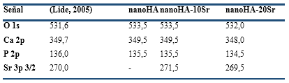 La Tabla 3, detalla las energías de enlace características de cada elemento químico presente en las hidroxiapatitas sintetizadas. Reportes de la literatura para la HA-Sr incluyen señales XPS: Ca2p3/2 (347,5 eV), O1s (531,5 eV), P2p3/2/Sr3d5/2 (133,5 eV), Sr3p3/2 (269,5 eV), además de la señal de C1s (285,0 eV). La señal ubicada a 133,5 eV se corresponde a la unión de Sr3d y P2p porque Sr3d5/2 (133 ± 0,5 eV), Sr 3d3/2 (135 ± 0,5 eV) y las líneas de P2p (132-133 eV) están ubicadas muy cerca una de otra. (Robinson, Salma-Ancane, Stipniece, Meenan & Boyd, 2017)