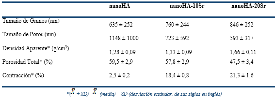 La Tabla 4 resume los valores calculados para distintas propiedades de las cerámicas obtenidas a partir de las nanoHA, nanoHA-10Sr y nanoHA-20Sr sintetizadas.