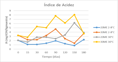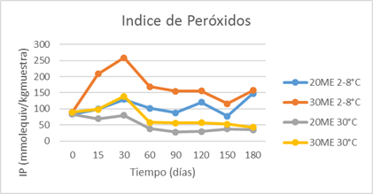 En la Figura 1 se muestran los IP obtenidos, donde prevalece una mayor estabilidad en las muestras almacenadas de 2-8 oC, no siendo así en las almacenadas a 30 oC. Eran de esperarse estos resultados durante el almacenamiento del producto, dadas las características de su IFA, además de la influencia que tiene la temperatura como catalizadora de las reacciones, en este caso reacciones de oxidación. Según los resultados de la Figura 2, hubo un aumento de la acidez en las muestras durante el tiempo, lo que puede estar dado por la formación de ácidos libres en pequeñas cantidades, proceso catalizado por la influencia de la temperatura, con los mayores IA a la mayor temperatura de almacenamiento (30 oC).