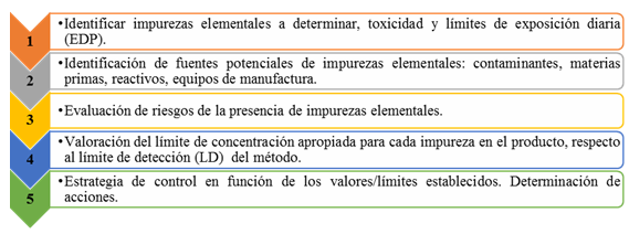 En este trabajo, se siguió la metodología general propuesta por las normativas de la USP farmacopea y las directrices Q3D del ICH para evaluar los riesgos potenciales por la presencia de impurezas elementales inorgánicas, en los productos farmacéuticos e ingredientes. La metodología consta de cinco etapas fundamentales (Figura 1):