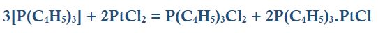 Cahours and Gal reported that the product of the reaction of monochloroacetic ether were beautiful yellow orange flakes, little soluble in water, practically insoluble in alcohol and ether, which could well be considered the result of a coupling of both reagents. The product of the reaction of monochloroacetic acid were fine yellow orange needles, which boiled for a few minutes in the presence of the solution of platinum dichloride yielded a very stable product, which was found to contain platinum. Cahours and Gal speculated that this substance could be product of the reaction between triethylphosphine and platinum dichloride, and for this reason they carried out a new experiment in which they boiled the aqueous solution of platinum dichloride with a slight excess of triethylphosphine. Concentration of the resulting liquid by boiling resulted in the precipitation of pale-yellow crystals, which were separated and boiled in alcohol until saturation. Cooling of the alcoholic solution resulted in the precipitation of beautiful and very fragile sulfur yellow prismatic crystals. Chemical analysis indicated that they contained, by weight, 28.63% carbon, 5.96% hydrogen, 12.33% phosphorus, 14.11% chlorine, and 38.97% platinum, corresponding to the formula P(C4H5)3. PtCl, and resulting from the following equation (Cahours & Gal, 1870a):
