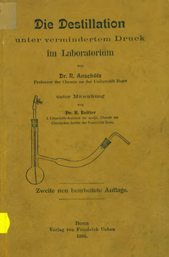 In 1887, the first edition of his Die Destillation unter vermindertem Druck im Laboratorium (The distillation under Reduced Pressure in the Laboratory) was published in Bonn (Anschütz, 1887c). Eight years later, a second edition of this book appeared in the same city. Its authors were Richard Anschütz and Hans Reitter (1865-1912). Figure 2 shows the title page of this edition (Anschütz & Reitter, 1895).