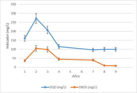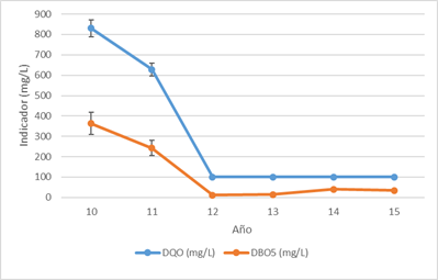 En el décimo año contemplado en el estudio, se puso en marcha en la empresa, a escala piloto, una de las producciones de mayor demanda relacionada con la producción de aceites ozonizados. Los primeros años de trabajo sirvieron de base para el control del proceso, así como de sus vertimientos. La figura 5 muestra los resultados del comportamiento de la DQO y DBO5.
