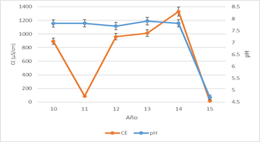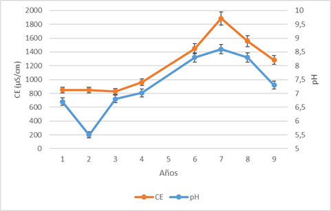Con la introducción de la nueva planta no se vieron afectados los indicadores de pH y CE (Figura 6). El pH se mantuvo por debajo de 8 unidades y la conductividad, salvo en una ocasión, por debajo de 1000 µS/cm, reportándose en todo momento valores inferiores a los recopilados en los estudios previos (Tabla 1).