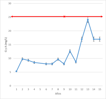 Los resultados que se muestran en la figura 7, durante los años consecutivos número 10 y hasta el 13, son consecuencia de la puesta en marcha, la gestión en las operaciones en la trampa de grasa y los ajustes de dicho órgano de tratamiento, lográndose a partir de esta etapa un comportamiento estable y favorable para las descargas de las aguas residuales de la empresa.