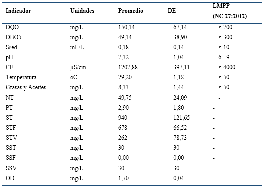 Los resultados promedios de las caracterizaciones previas de las aguas residuales de la Empresa en el punto de confluencia se muestran en la Tabla 1.