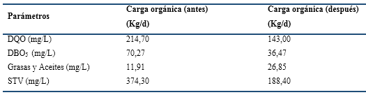 Los mayores valores de la carga orgánica contaminante son los expresados por los sólidos totales volátiles y la DQO (Tabla 2).