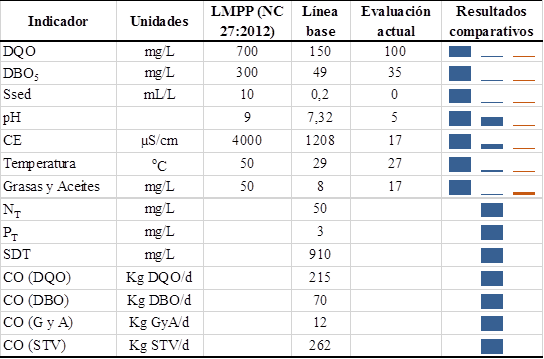 Un indicador que brinda una medida real del comportamiento favorable de las descargas es la carga orgánica dispuesta al medio expresado en función de sus diferentes parámetros. En la tabla 4 se reflejan dichas comparaciones, las cuales resultaron inferiores a las reportadas en la línea base definida para la empresa (Tabla 3), excepto para las grasas y aceites, que, aunque tuvo un ligero aumento es considerado muy inferior a los vertimientos reportados en la literatura para corrientes similares o que involucran el empleo de grasas en sus actividades (ONN, 2007; Díaz y Vega, 2013; Aboutaleb, et al., 2018; Magnago, et al., 2018; Rodriguez, et al., 2020).
