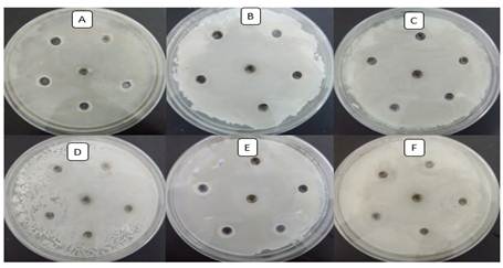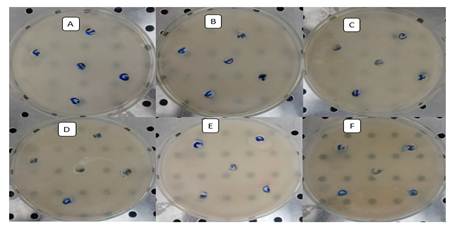 En este ensayo se añadió el medio de cultivo líquido de manera aséptica en placas Petri estériles. Una vez gelificado el medio se añadieron los inóculos en cada placa y se diseminaron con espátula de Drigalsky. Posteriormente se perforaron 6 pocillos de 7 mm de diámetro en cada placa con un perforador metálico previamente esterilizado. Se añadieron 0.2 ml de la suspensión de cada cepa en los pocillos perforados, estos fueron identificados. Las placas se incubaron a 37 0C durante 48 horas. Una vez concluida la incubación se observó la presencia o no de halos de inhibición en los bordes de los pocillos.