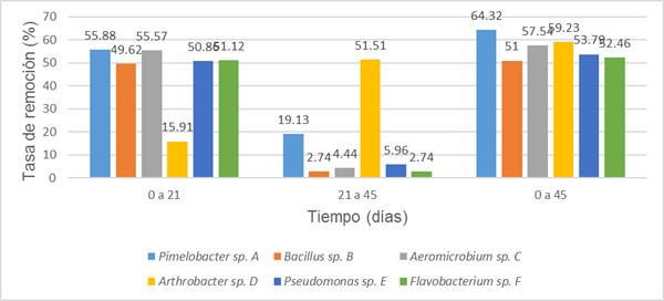 La cepa (D) Arthrobacter sp. mostró un valor de 15,91 %, muy bajo en comparación con las mencionadas anteriormente. En el intervalo de 21 a 45 días, la cepa (A) Pimelobacter sp. presentó un valor de degradación de 19,13 %. El resto de las cepas estuvieron entre 2,74 y 5,96 %, sin embargo, la cepa (D) Arthrobacter sp. tenía el valor más alto de este período con un 51,51 %. Esta cepa requiere un proceso de adaptación al diésel superior al resto, ya que, una vez que logra adaptar su metabolismo a esta fuente de carbono su degradación es acelerada. Al final del experimento, todos los valores de las tasas de remoción, fueron superiores a 50 %, destacando las cepas (A) Pimelobacter sp. y (D) Arthrobacter sp. con 64,32 y 59,23 % respectivamente.