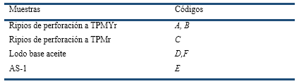 Se trabajó a partir de cinco muestras de corte y/o ripios de perforación a un tamaño de partículas mayor y menor (TPMYr y TPMr), agente separador (AS-1) y lodo base aceite, obtenidas de la conformación del fluido de perforación en la explotación del pozo Bacuranao 300 L. Las muestras fueron tomadas en frascos de vidrio estériles.