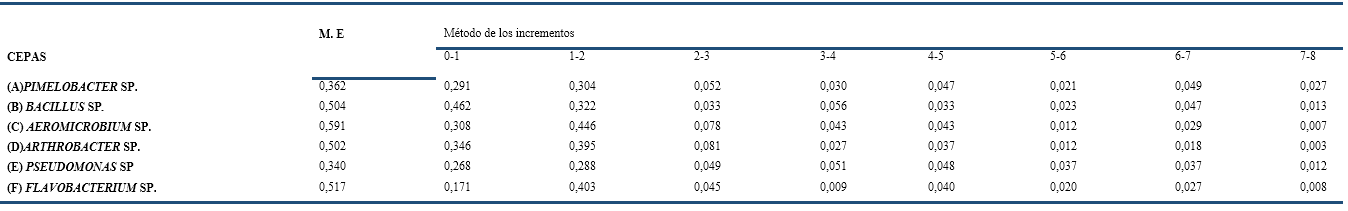Al analizar las velocidades de crecimiento calculadas por el método exponencial y el de los incrementos, se aprecia que los valores de las cepas (A) Pimelobacter sp. y (E) Pseudomonas sp. son similares (0,3629 y 0,3400 h-1 respectivamente, por el método exponencial). Por lo tanto, estas cepas pudieran inocularse a la misma vez para conformar el cultivo del consorcio deseado. De las 2 a las 3 h, la cepa (D) Arthrobacter sp. muestra la mayor velocidad de crecimiento (0,0813 h-1) según el método de los incrementos.
