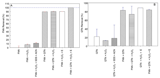 Interestingly, in comparison with the complete EMS system (FNN+QTN+E+H2O2), which after 24 hours incubation, yielded 100% transformation FNN (Figure 1A), it was observed that in absence peroxidase (E), the presence of QTN itself or with H2O2, was able to promote ~92% transformation of FNN. A level similar to that produced when the E and H2O2 were present. Such observation agrees with previous hypothesis for the enzymatic removal of FNN (Calva et al., 2016), where the stoichiometric analysis predicted a removal of 100% of FNN (50µM) by the EMS system containing 300 µM QTN (Rivera-Casado et al., 2015a, Calva et al., 2016), and confirm the suggestion that the transformation of FNN does not require the participation of the oxidative E if QTN is present. This assumption matches with the removal ratio (Figure 1B), and profile (Figure 2) for the removal of QTN, which was completely removed earlier than FNN with a removal profile pattern very similar to that previously reported for FNN (Rivera-Casado et al., 2015a, Calva et al., 2016).