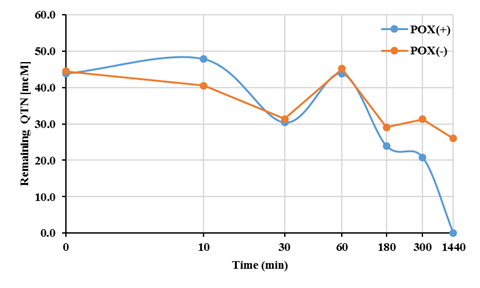 These results point out clearly that combination of QTN with H2O2 seems to be an important factor for the removal of FNN, and that H2O2 is used by peroxidases for the oxidation of both FNN and QTN. Therefore, the effect of H2O2 and the radish peroxidase over the oxidation of QTN in the EMS system was further examined and the results presented in the next section.