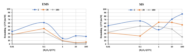 Effect of H2O2 and peroxidase over the oxidation of QTN in the EMS system. The removal of QTN as function of the H2O2 initial amount (0-30 mM) for the oxidation of FNN by the EMS reaction mixture after three incubation times (2, 30. 180 minutes), in the presence (EMS), and absence (MS), of radish peroxidase was examined by using a factorial 5x2 experimental design by estimation of the residual QTN (Figure 3). As expected, as the incubation time increases, the remanent QTN was lower, however the amount with (EMS) and without (EM9 peroxidase was similar. As mentioned above, the presence and concentration of H2O2 are fundamental parameters for the activity of peroxidases. The concentration range of H2O2 was chosen on the bases of reports for peroxidases from plant tissue, which corresponds to 0.6 - 10 μmol/g of fresh tissue (Cheeseman 2006).