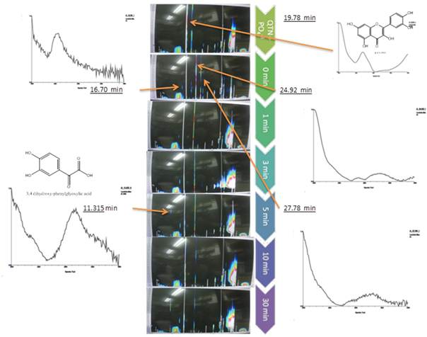 As can be appreciated, the results showed that oxidation of QTN occurs after 2 minutes from addition of the H2O2 to the reaction mixture, even in absence of the enzyme (Figure 3, MS). This observation was confirmed by HPLC spectral analysis for extracts from de reactions mix (Figure 4), where just after 3-5 minutes, the presence of QTN metabolites with retention times of 16.7 min, 24.92 min, and 27.7 min were clearly detected. Interestingly, an oxidation product with a retention time of 11.3 min was detected after 5 minutes of reaction, showing a spectrum that yield positive correlation with 3,4 dihydroxy-phenylglyoxylic acid, however no further identification of this compound was performed.