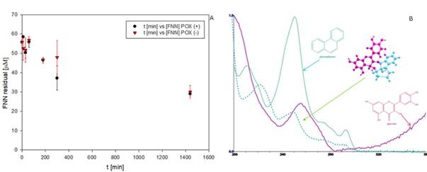 Removal of FNN in the EMS system by using QTN as metabolic mediator. The FNN removal was up to 50% in 24h (Figure 5), with a rate of disappearance of 0.047 μM FNN/min during the first 5h. These results were similar to that reported previously for the kinetic for oxidation of FNN in the presence of QTN (Rivera-Casado 2010, Calva 2016); however, it is interesting to note that the behavior of the FNN removal curve after 6.7 hours was similar in the presence (POX+) and in the absence (POX-) of peroxidase (Figure 5). These observations confirm that the presence of the enzyme was not decisive for the removal of FNN, but only in very short reaction times, or that the enzyme catalyzes the transformation of other compound at early times. This hypothesis was supported by the fact that after 24 hours of reaction, the remaining amount of QTN was estimated to be 41%. It should be noted that this data is the first report where the variation of the concentration of the metabolic mediator through the removal of PAH by EMS system has been reported. Further, as observed in Table 1, the variation in the rate of transformation of FNN as a function of the concentration of H2O2, shows that the presence of H2O2 up to a concentration of 3000 μM, in general, positively affects the transformation of FNN, reaching values for rate of disappearance up to 0.02 μM FNN/min. However, a negative effect was observed at excessive concentrations of H2O2 (30000 μM). Interestingly, in the absence of enzyme (E-), the rate of disappearance of FNN at low peroxide concentrations showed values similar to the maximums reached with the complete reaction mixture, and gradually decreased with the increase in the amount of H2O2. However, in the absence of the QTN mediator (M-), the rate increased or remained almost constant at peroxide concentrations below 30000 μM.