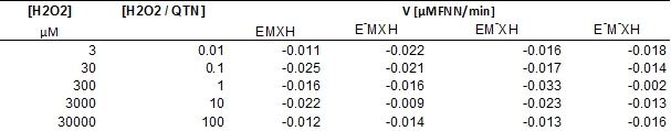 The complete reaction mix EMXH was constituted by FNN 50µM (X), QTN 100µM (M), and 187 mU/μl of radish peroxidase (E), while incomplete reactions mix lack of peroxidase enzyme (E-), QTN (M-), or peroxidase enzyme and QTN (E-M-XH).