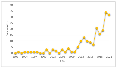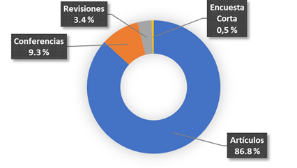 Uno de los primeros aspectos que se observan es que la mayor parte de los documentos publicados (cerca del 86,8 %) son artículos resultados de investigaciones empíricas. Luego le siguen las conferencias (9,3 %) y las revisiones teóricas (3,4 %) (Figura 1).