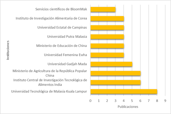 Un total de 158 instituciones han participado en las investigaciones relacionadas con la extracción de los compuestos activos del jengibre de las cuales se seleccionaron las más destacadas (más de tres publicaciones) (Figura 2).