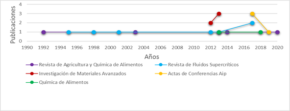 Las revistas más notorias (más de dos publicaciones) entre las 141 revistas científicas registradas en la búsqueda (Figura 2) fueron: Journal of Supercrítical Fluids (siete publicaciones) y Advanced Materials Research (cinco publicaciones), destacándose además la Journal of Agricultural and Food Chemistry (cuatro publicaciones) como la revista que comenzó a publicar los estudios sobre la extracción de jengibre en 1992 (Figura 3).