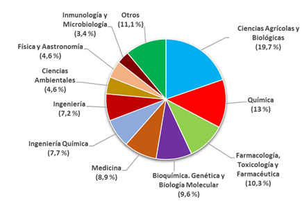 Se analizaron diversas áreas investigativas en las que el extracto de jengibre tiene gran aplicación. El mayor porcentaje respecto a las 21 áreas examinadas lo tuvo el campo de las ciencias agrícolas y biológicas (82 publicaciones, 19, 7 %) aunque, esferas como la química, farmacología, biología molecular, medicina e ingeniería presentan notables investigaciones superiores a las 30 publicaciones en el período de estudio (Figura 4).