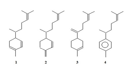 El jengibre contiene muchos componentes necesarios para una buena nutrición como fibra, calcio, fósforo, entre otros. Posee de 4,0 a 7,5 % de oleorresina, en la que se destacan el aceite esencial (constituido mayoritariamente por los hidrocarburos sesquiterpénicos α-zingibereno, (-sesquifelandreno, (-bisaboleno, α-curcumeno, entre otros) (Figura 6) y sustancias pungentes (gingerol y shogaol) (Bhattarai, 2001).