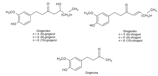 El aroma placentero del jengibre se debe a los compuestos volátiles presentes en el aceite esencial, mientras que el gusto pungente cálido es causado por los componentes no volátiles, tales como los gingeroles, shogaoles y la zingerona (Figura 7). El componente mayoritario, gingerol, es una mezcla de homólogos con 10, 12 y 14 átomos de carbono en la cadena lateral, nombrados como (6)-, (8)- y (10)-gingerol (Batista et al., 2003).