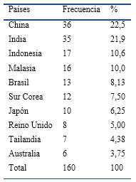 Sobresalen instituciones como la Universidad Tecnológica Kuala Lampur con un total de ocho publicaciones sobre el tema. Las más notorias pertenecen a países asiáticos como India y China (primeros exportadores de la planta a nivel mundial), los que a su vez son los contribuyentes principales a estas investigaciones con 22,5 y 21,88 % respectivamente, seguidos por otros 51 países resultantes en la búsqueda (Tabla 1).