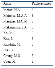 Se examinaron los autores más destacados en la investigación sobre el tema (más de tres publicaciones) siendo sobresaliente Noor Azian Morad con cinco investigaciones (Tabla 2), de 159 autores el 62 % con una publicación y el 29 % con dos publicaciones.