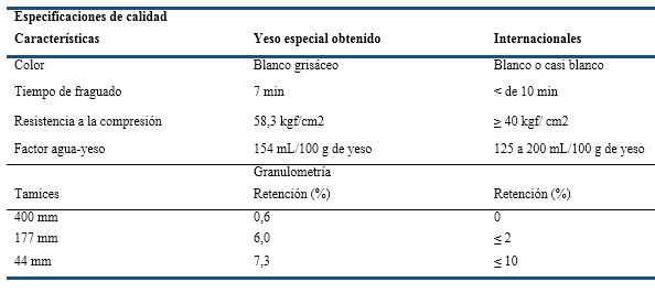 La caracterización física del yeso especial, obtenido a escala industrial, reveló que éste cumplía satisfactoriamente las especificaciones de calidad internacionales, Tabla 1, expresado en el adecuado comportamiento de sus resistencias mecánicas, compresión y flexión además del factoragua-yeso representado en la Figura 1.